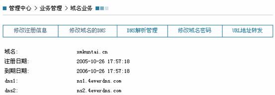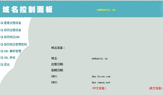 2、   登录域名控制面板,页面将显示域名注册信息及功能菜单,名独立控制面板所具备的功能与管理中心域名DNS管理相同。点击每一个功能菜单,可进入相应的操作界面,操作方式也同管理中心域名DNS管理,也可以在此修改域名的管理密码。