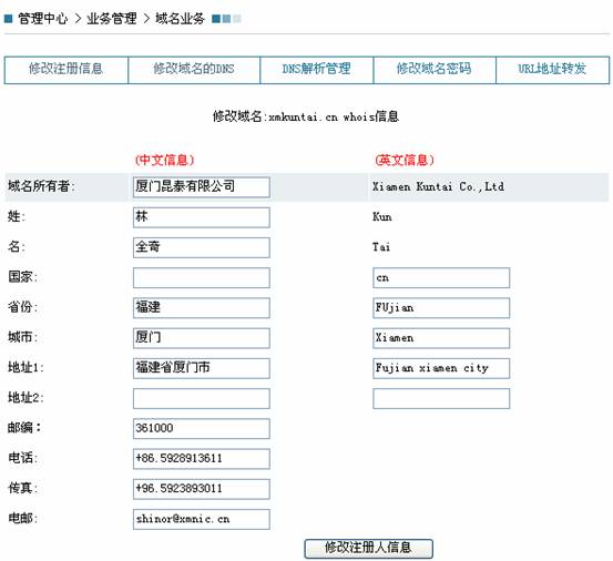 2-1修改相关信息后,点击每个表格下相关修改按钮即可。用户可随时修改注册信息,包括所有者联系信息,管理者、技术联系人等信息。(注:域名所有者和姓名不能修改,如有更改,需按域名过户手续来办理)