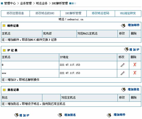 2-3:点击“增加IP”等链接即可进入相关管理界面,进行解析记录管理。解析记录管理包括“增加IP”、“增加别名”及“增加邮件”三项管理功能。